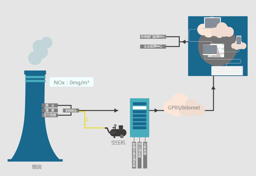 此項目采用我司自主研發的JXHB V1.0智慧環保管理系統,是采用進口元器件設計的連續監測系統。此次項目主要監測污染物氮氧化物(NOx)等。單套監測系統采用監測平臺探頭+預處理+工控機+液晶顯示器+數采儀的架構模式完成對監測數據的接收、存儲、顯示、傳輸的功能要求。前端在線監測系統主要有以下意義: